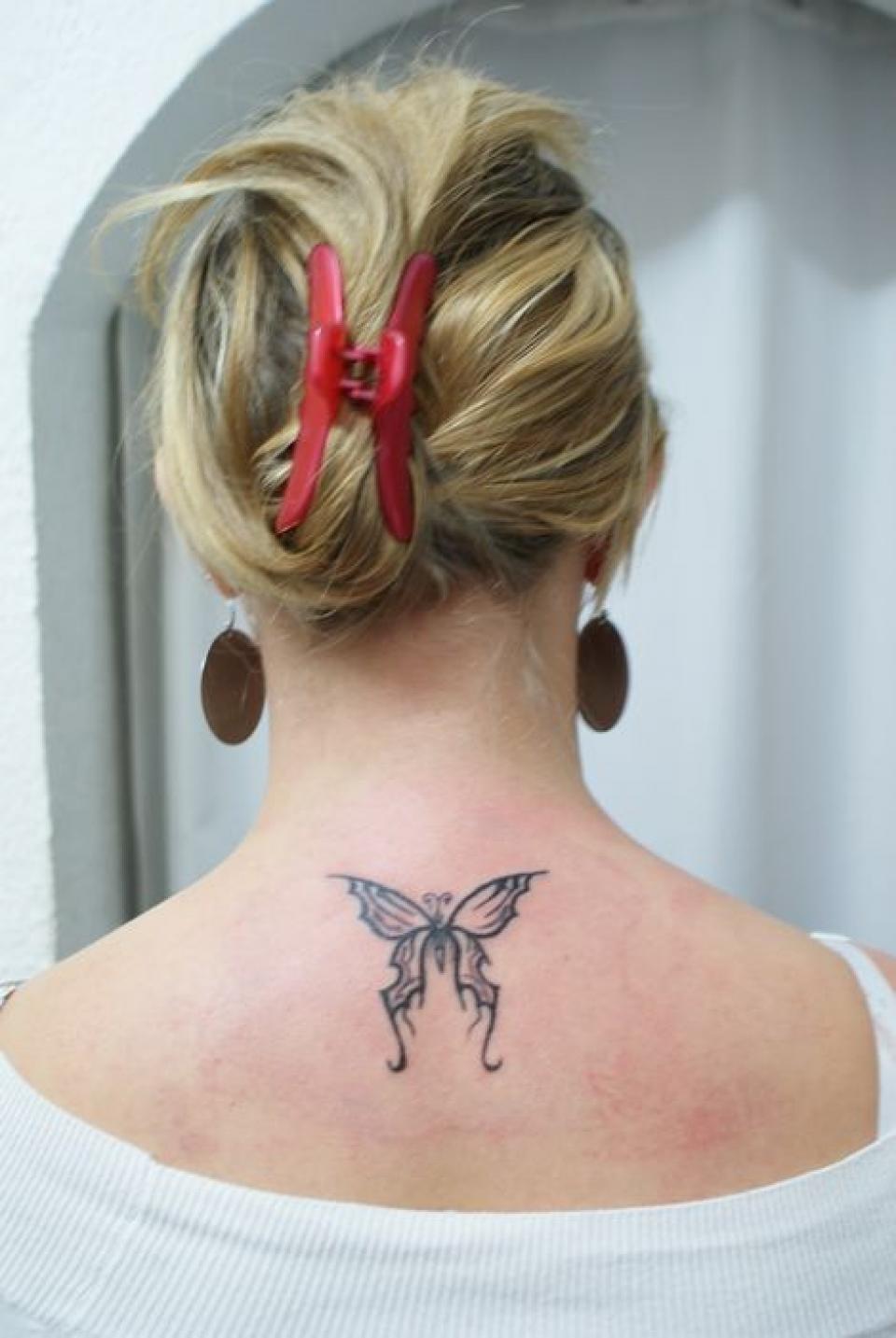 Tatouage d' un petit papillon dans la nuque . Réalisé par Serge Tattoo Evolution Perpignan